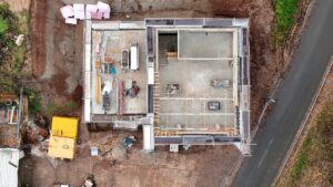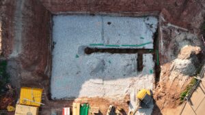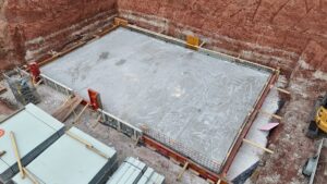 So sieht das Untergeschoss aus. Hier noch zur Hälfte Schalung, die andere Hälfte bereits Beton.