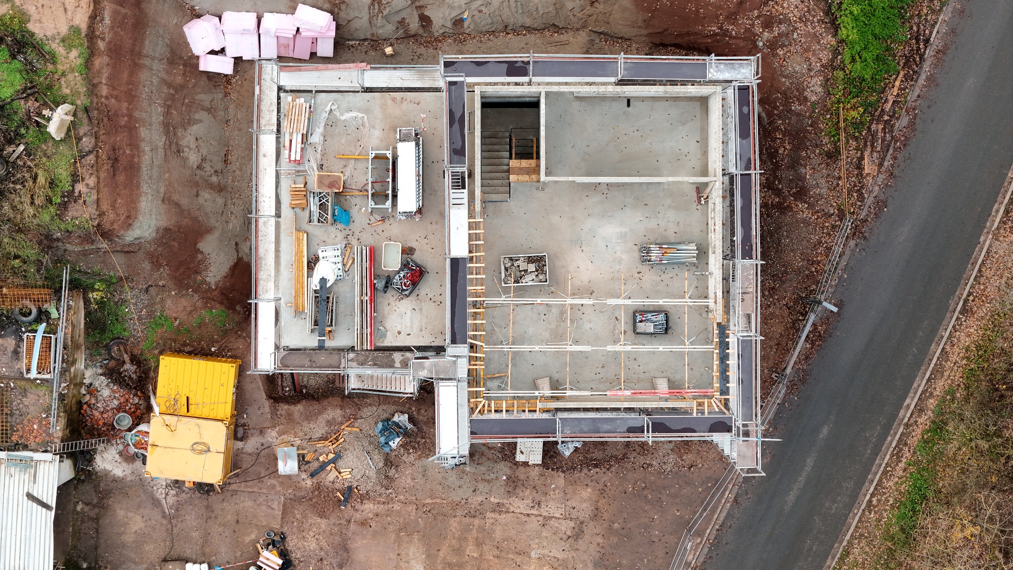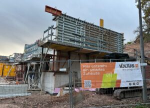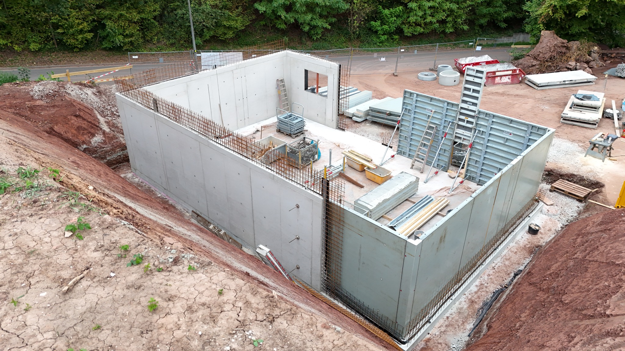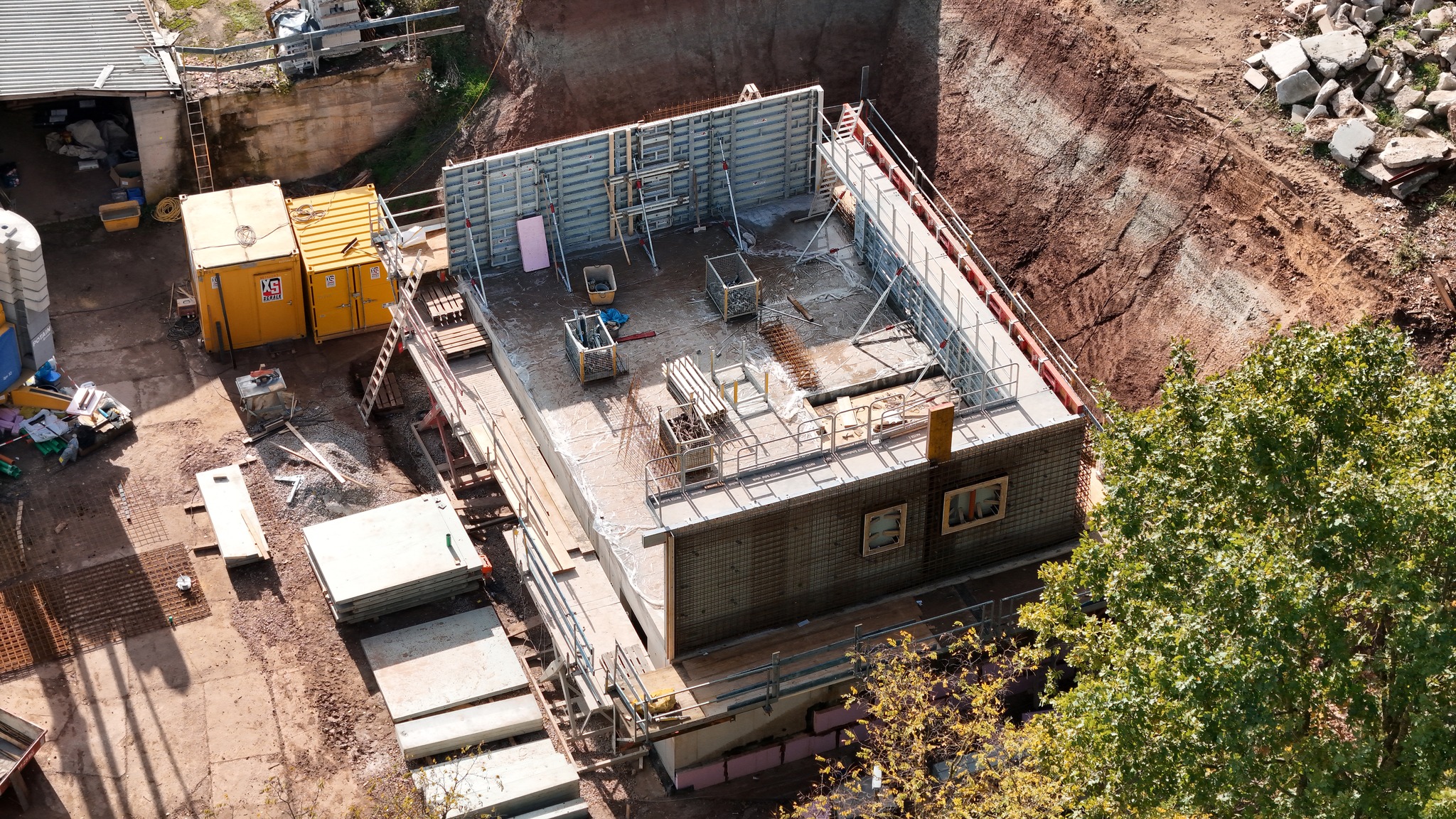 So sieht das Untergeschoss aus. Hier noch zur Hälfte Schalung, die andere Hälfte bereits Beton.